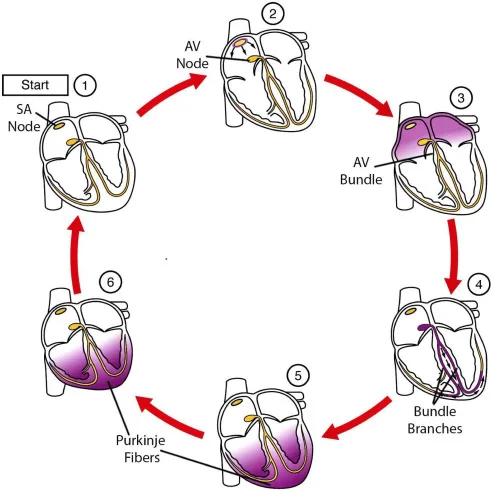 • Ventricular Contraction: Ensures that ventricles contract from the bottom upwards, efficiently pumping blood into the arteries (aorta and pulmonary artery).